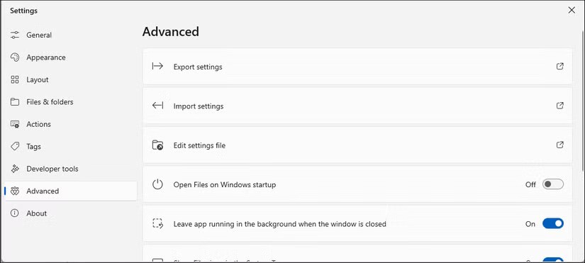 Caixa de diálogo de configurações avançadas no aplicativo Arquivos no Windows 11