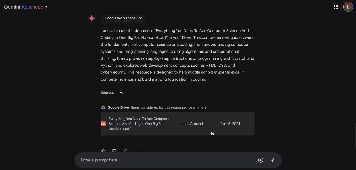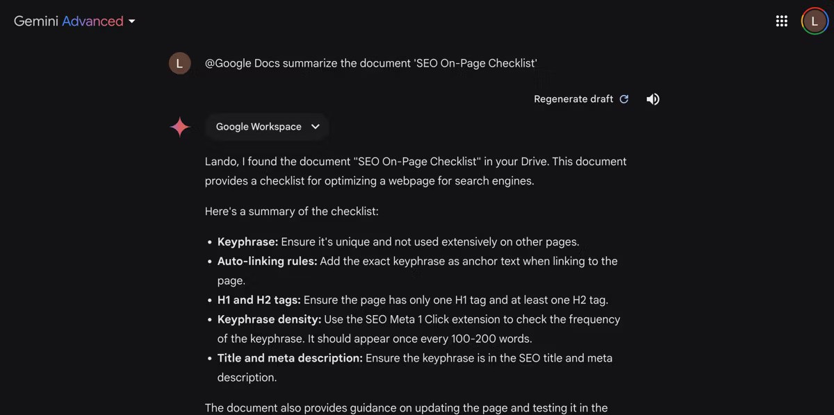 Se você usa o Google Docs regularmente para trabalho, escola ou projetos pessoais, também pode acessar seus documentos por meio da extensão Gemini Workspace. O comando @Google Docs é uma maneira útil de interagir diretamente com arquivos do Google Docs no Gemini. Aqui estão alguns exemplos: