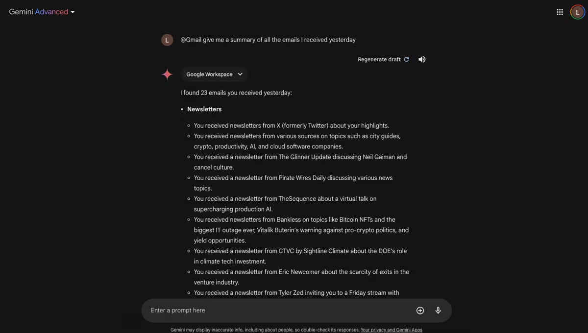 Peça ao Gemini para fornecer um resumo de todos os e-mails que você recebeu durante um período específico, por exemplo: