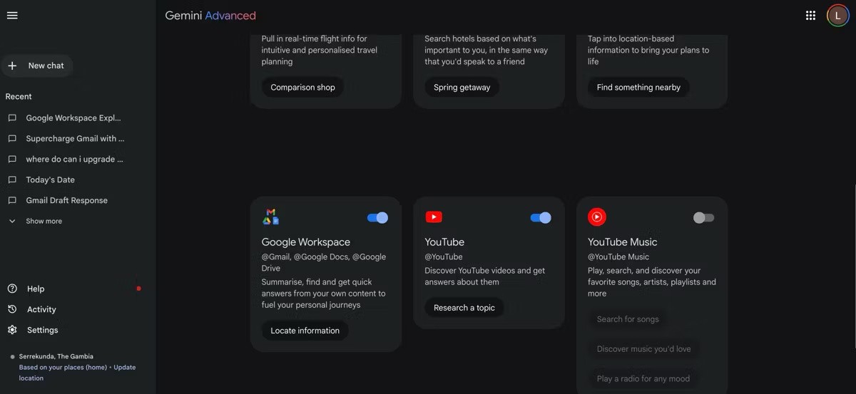 Você encontrará diversas ferramentas, incluindo Google Flights, Google Hotels e Google Maps. No entanto, neste guia, vamos nos concentrar nas extensões do Google Workspace (que incluem Gmail, Docs e Drive) e no YouTube.