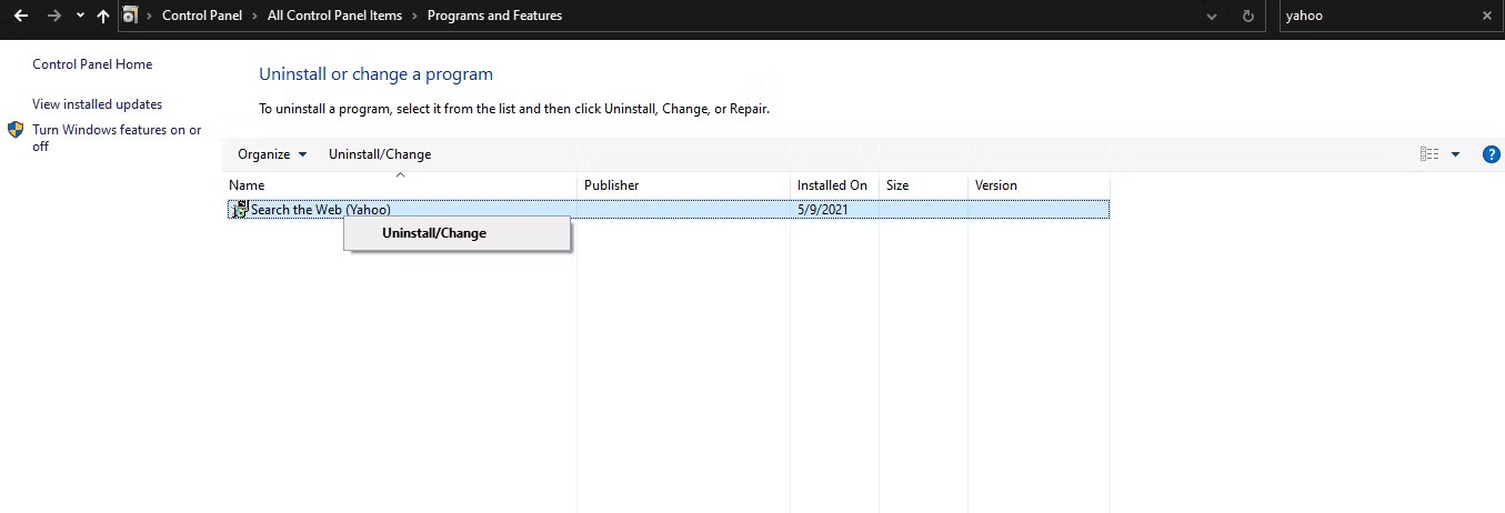 Para fazer isso, digite Painel de Controle na Pesquisa do Windows , abra o aplicativo Painel de Controle e vá para Programas e Recursos . Aqui, procure por quaisquer programas suspeitos que possam estar relacionados ao Yahoo, clique com o botão direito em cada um e selecione Desinstalar .